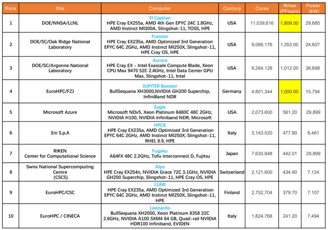 11月17日,评测超级计算机计算能力的权威排行榜——第66届国际超算TOP500榜单在SC25大会上正式揭晓。本次榜单最大亮点在于,德国于利希超算中心的“JUPITER Booster”完成全面部署后,性能成功突破E级(百亿亿次/秒)大关,不仅成为欧洲首台E级超算,更是TOP500榜单中的第四台E级超算系统。整体来看,本届榜单TOP10阵营保持稳定格局,美国能源部旗下的El Capitan、Frontier、Aurora三台E级超算继续包揽前三,无新系统跻身前十。